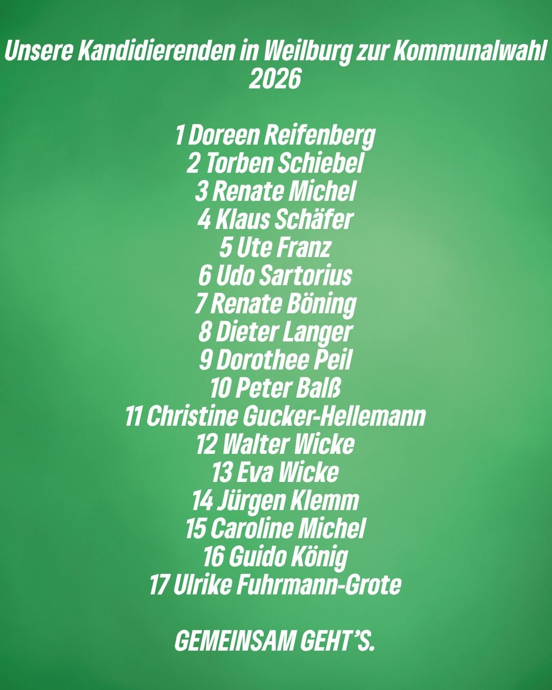 Doreen Reifenberg und Torben Schiebel führen die Liste an. Renate Michel, Klaus Schäfer und Ute Franz folgen auf den vorderen Listenplätzen. Alle Kandidierenden engagieren sich mit Leidenschaft und voller Energie für Weilburg.